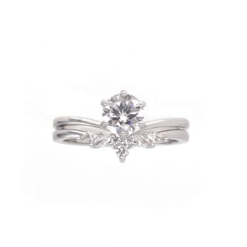 This stunning ring features a single, striking chevron-shaped cubic zirconia (CZ) stone set in a solitaire setting, paired with a separate chevron-patterned band. The modern design and sparkling CZ stones create a sophisticated and eye-catching look.