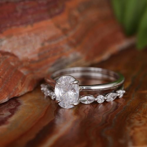 This elegant ring features an oval-shaped white cubic zirconia (CZ) stone set in a solitaire setting, paired with a separate band adorned with additional CZ stones. The combination creates a sophisticated and luxurious look.